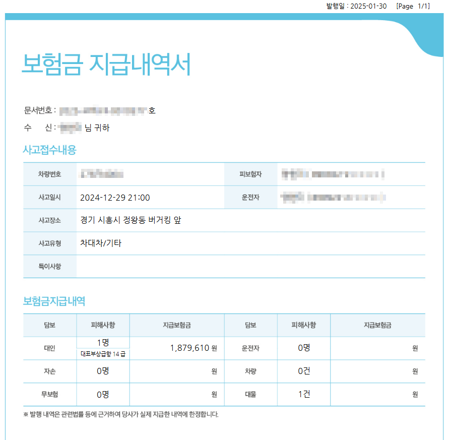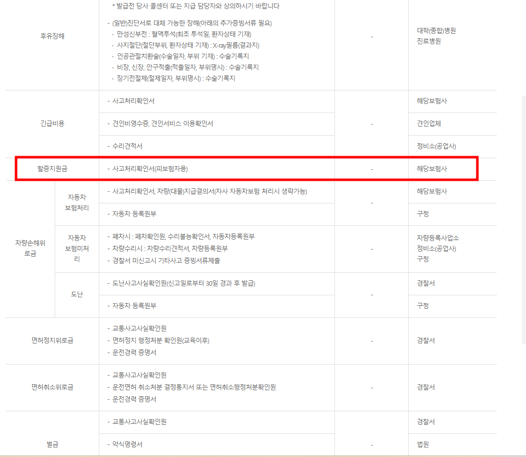 필요한 서류는 자동차보험에서 대인 보험료를 지급했다는 증빙서류 #보험금지급내역서 입니다.