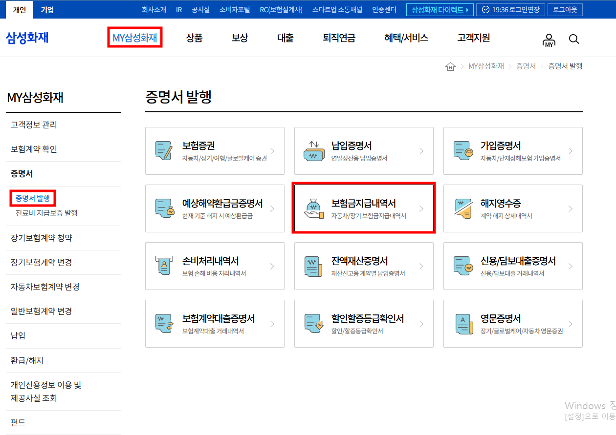 MY삼성화재->증명서->증명서발행->보험금지급내역서 클릭해 줍니다.