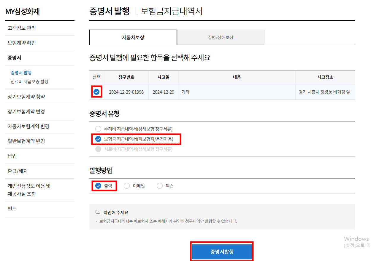 해당 사고 클릭->보험금 지급내역서 ->출력->증명서 발행 클릭해 주시면