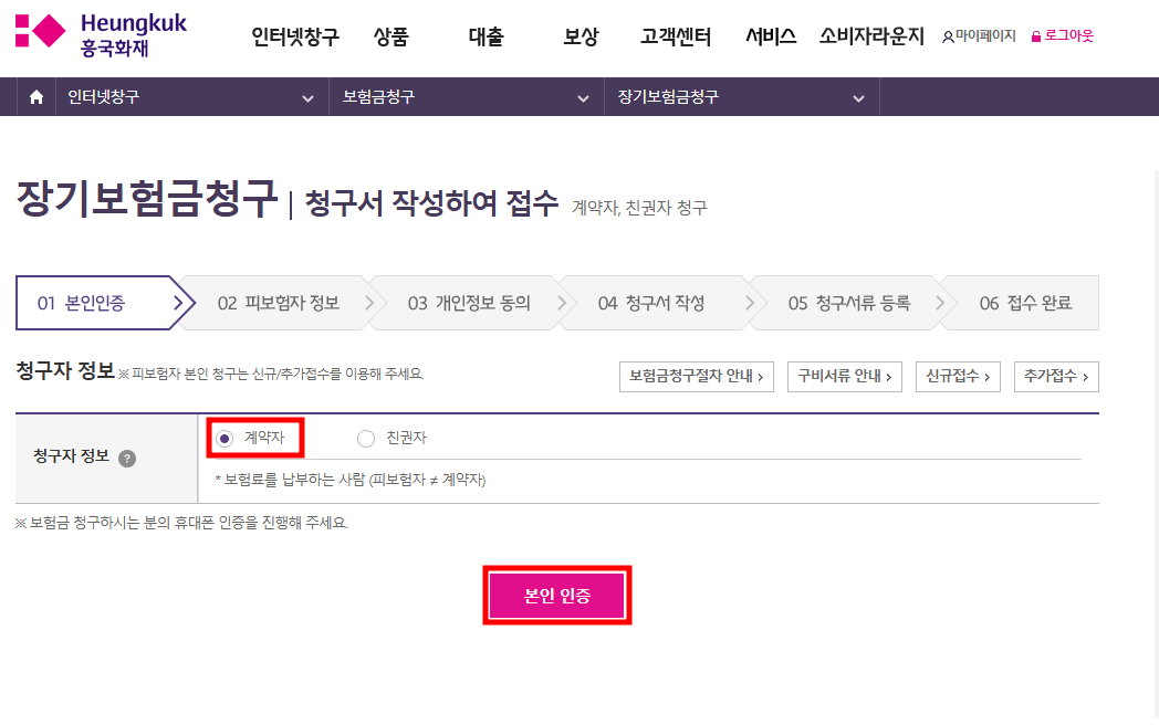 장기보험금청구 메뉴에서 계약자접수 클릭