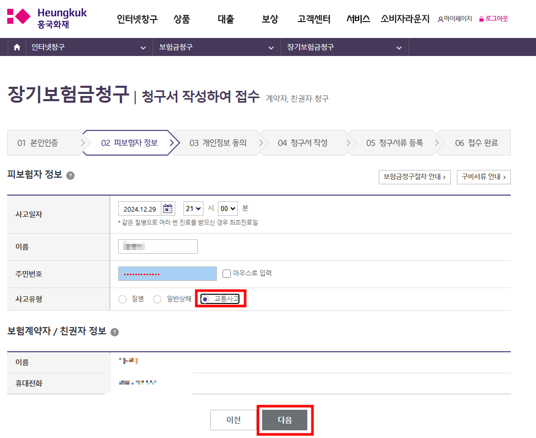 사고일자 입력 후 사고유형에는 교통사고 클릭 후 다음