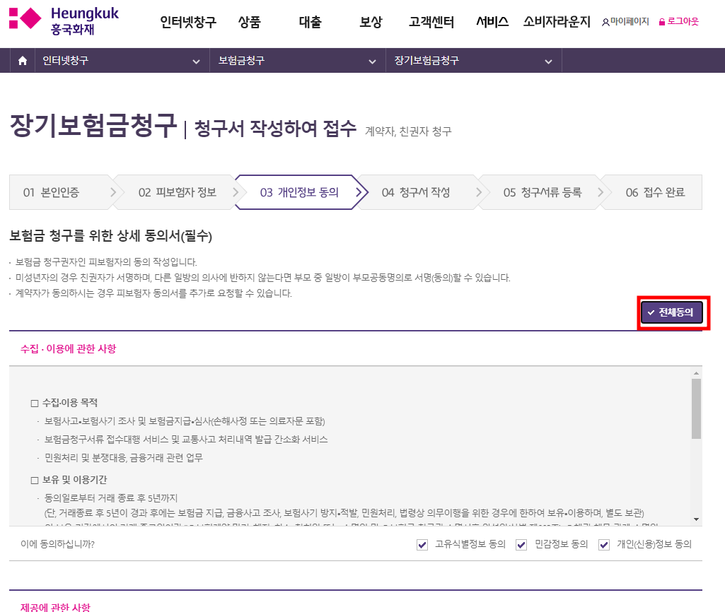 개인정보 동의 메뉴에서 전체동의 클릭해 줍니다