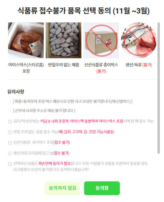 식품류, 편지봉투(A4서류봉투) 등 기타 상품 절대 접수 불가