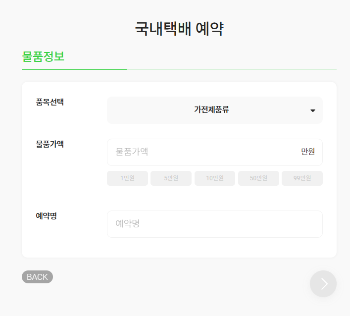물품가액, 예약명 입력하시고 다음페이지로 고고